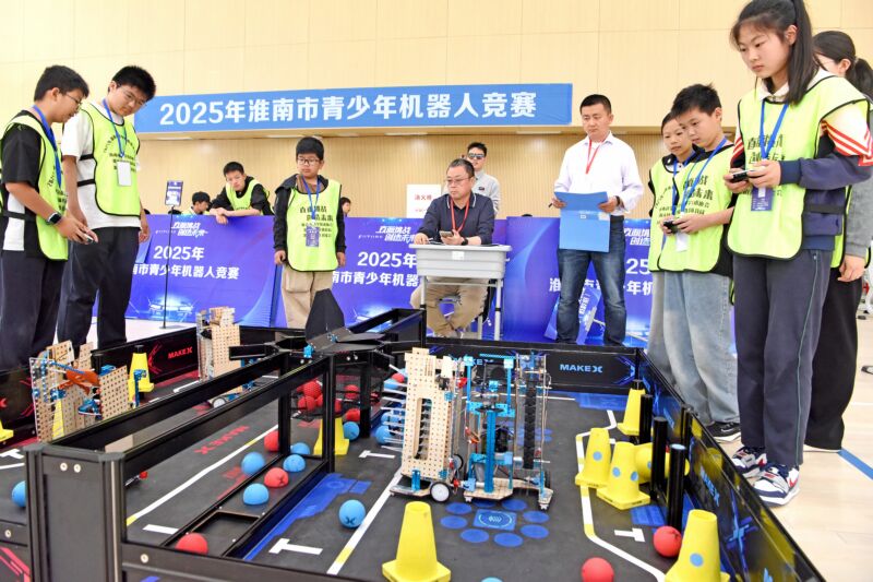 日前,由市科學(xué)技術(shù)協(xié)會、市教育體育局、淮南高新區(qū)共同主辦的2025年淮南市青少年機器人競賽在北京師范大學(xué)淮南實驗學(xué)校舉行,來自全市各中小學(xué)校的142支隊伍、270名選手參加了9個項目的競賽;顒又荚谕苿又行W(xué)機器人教育發(fā)展,培養(yǎng)青少年創(chuàng)新精神和實踐能力。圖為參賽選手在進行激烈比拼。
