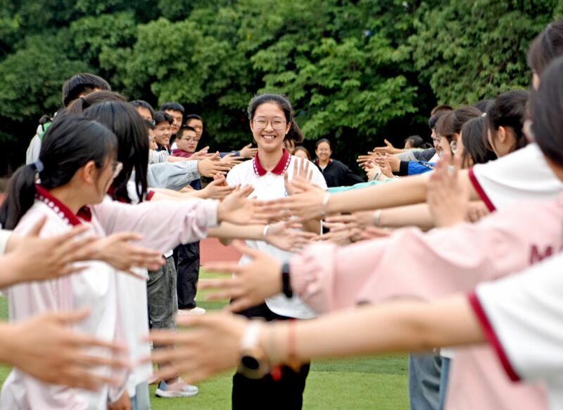 高考臨近,我市組織高三學生開展不同形式的減壓活動,幫助學生放松心情,迎接高考。圖為5月26日,淮南一中高三學生在操場上參加“擊掌加油”減壓游戲,放松心情迎接高考。