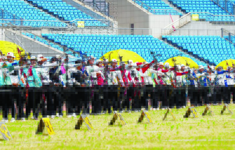 圖為:比賽過程中,運動員力爭每一箭都射出滿意成績。