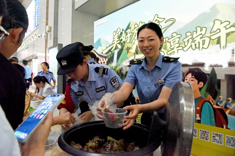 5月31日,淮南南站候車(chē)室,車(chē)站工作人員為旅客贈(zèng)送粽子。當(dāng)日是端午節(jié),中國(guó)鐵路上海局集團(tuán)有限公司淮南西站組織管內(nèi)車(chē)站開(kāi)展“美好旅途 ‘粽’享端午”主題活動(dòng),車(chē)站工作人員邀請(qǐng)旅客品嘗粽子、制作端午香包,感受傳統(tǒng)文化魅力。