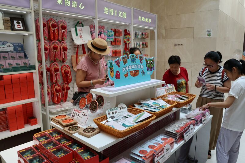 安徽楚文化博物館注重開發(fā)獨具楚文化特色的文創(chuàng)產品,產品涵蓋漆木果盤、楚金幣冰箱貼、百廿壽印章掛軸、楚韻紋飾工藝品等,充分展現楚文化的瑰麗與深厚底蘊。圖為8月24日,游客們在館內挑選心儀的文創(chuàng)物件。