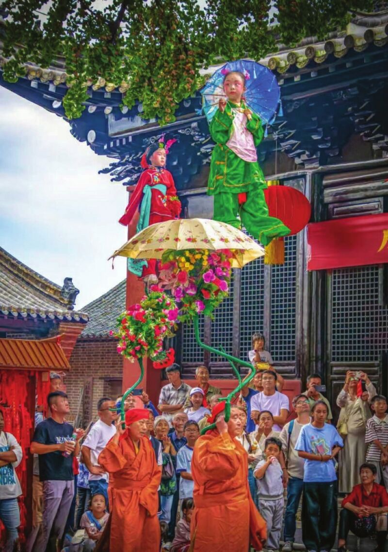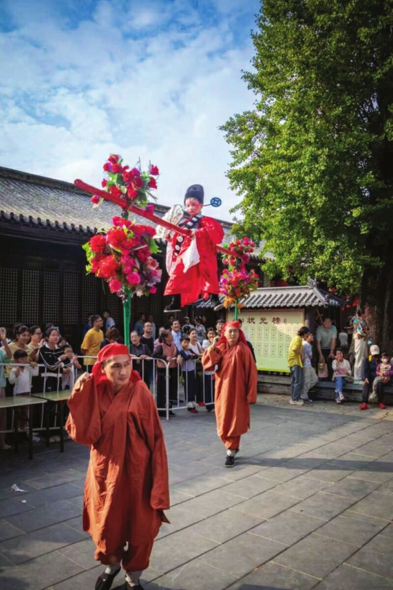 現(xiàn)場(chǎng),抬閣與肘閣輪番亮相。肘閣上,小演員扮成傳統(tǒng)戲劇人物,在成人頂托的鐵架上輕搖慢擺,盡顯“空中芭蕾”之美;抬閣則由多人抬行,各色人物造型傳遞祈福寓意,被譽(yù)為“肩膀上的戲臺(tái)”。