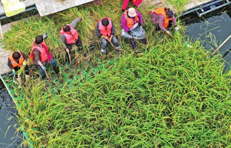 10月14日,工人在淮南市鳳臺縣顧橋鎮(zhèn)采煤沉陷區(qū)水面上收獲漂浮式水稻(無人機照片)。