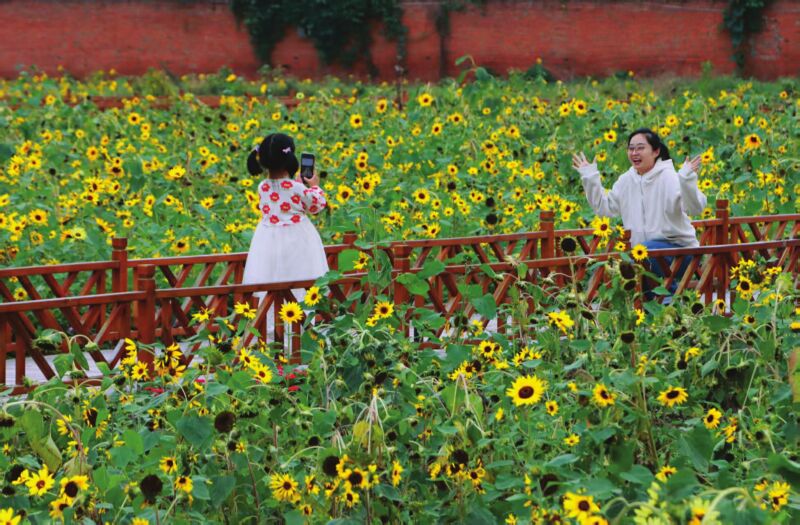 寒露時(shí)節(jié),大部分花卉已褪去了絢麗的色澤,壽縣古城香草小鎮(zhèn)院內(nèi),矮生多頭向日葵——菊芋依然展露笑顏,熱情地迎接著每一位游人。