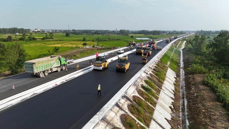 受汛期強(qiáng)降雨影響,項(xiàng)目建設(shè)工期壓力巨大。為此,項(xiàng)目部提前設(shè)置臨時(shí)排水溝、布置集水井等針對(duì)性措施,確保防雨篷布等物資就近儲(chǔ)備,建立氣象預(yù)警聯(lián)動(dòng)機(jī)制,保障施工質(zhì)量和作業(yè)連續(xù)性。同時(shí),搶抓晴好天氣“窗口期”,先后投入全斷面瀝青攤鋪機(jī)、雙鋼輪壓路機(jī)及膠輪壓路機(jī)等大型作業(yè)設(shè)備10余臺(tái)套協(xié)同作業(yè),配備作業(yè)工人120余名,創(chuàng)造單日瀝青攤鋪里程突破3千米的“淮桐速度”。