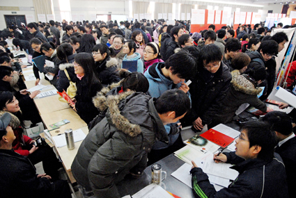 1月16日,淮南師范學(xué)院2010屆畢業(yè)生在校園就業(yè)洽談會上尋找工作。當(dāng)日,由淮南師范學(xué)院、淮南市職業(yè)介紹服務(wù)中心主辦的淮南師范學(xué)院2010屆畢業(yè)生就業(yè)洽談會在校園餐廳舉行,來自省內(nèi)外的150余家用人單位提供就業(yè)崗位3300余個,滿足該校2010年應(yīng)屆畢業(yè)生就業(yè)需求。