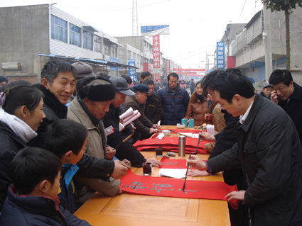 春節(jié)前夕,鳳臺縣尚塘鄉(xiāng)邀請縣宣傳、文化、文明辦等部門書畫名人到該鄉(xiāng)開展為群眾送春聯和年畫活動,縣花鼓燈藝術團演員也前往演出助興,為新年增添喜慶氛圍,深受廣大群眾的歡迎。