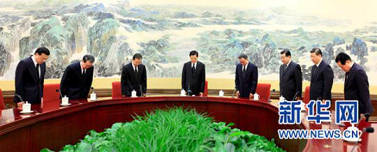 8月15日上午,中共中央政治局常務(wù)委員會會議在中南海舉行。會議開始時,胡錦濤、吳邦國、溫家寶、賈慶林、李長春、習(xí)近平、李克強、周永康等全體起立,向在甘肅舟曲特大山洪泥石流中遇難的同胞默哀。新華社發(fā) 國旗低垂,江河嗚咽,訴說無盡哀思。8月15日,在甘肅舟曲特大山洪泥石流發(fā)生第7天時,全國舉行哀悼活動,深切哀悼在這次災(zāi)害中遇難的同胞。胡錦濤、江澤民、吳邦國、溫家寶、賈慶林、李長春、習(xí)近平、李克強、賀國強、周永康在北京等地,同全國各族人民一起,向甘肅舟曲特大山洪泥石流遇難同胞表示深切悼念。