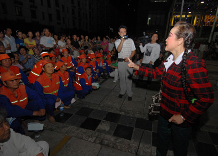 圖為8月20日晚,田家庵區(qū)洞山街道新村社區(qū)文藝愛好者聶鵬梅為納涼的環(huán)衛(wèi)工人演唱豫劇《朝陽溝》。