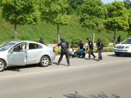 9時(shí)許,行動(dòng)正式開始,總指揮接到市公安局指令稱,“犯罪嫌疑人”是兩名年約30-40歲的中年男子,駕駛一輛灰色無(wú)牌的小轎車往隧道方向駛來(lái),現(xiàn)設(shè)點(diǎn)盤查進(jìn)行抓捕,由交警對(duì)車輛進(jìn)行檢查,同時(shí)刑警、特警配合攔截抓捕。任務(wù)分配后,交警首先在現(xiàn)場(chǎng)對(duì)車輛進(jìn)行攔截,尤其是灰色無(wú)牌小轎車成為首選目標(biāo),9時(shí)5分,第一輛灰色小轎車被交警攔下,交警要求駕駛員熄火下車,提供“兩證”并打開后備廂,然后由特警配合進(jìn)行檢查,大約檢查了20輛車后,9時(shí)15分,一輛灰色無(wú)牌小轎車駛?cè)肟c(diǎn),可駕駛員并沒(méi)有按照交警的指示靠邊停車,反而是加大油門沖卡一直往南開去,這一異常舉動(dòng)讓隨時(shí)待命的交警、特警及刑警覺(jué)得可疑,并通過(guò)手臺(tái)向隧道南段的特警通報(bào)進(jìn)行攔截。9時(shí)18分,在離隧道200米的距離,這輛無(wú)牌小轎車被特警逼停,四名特警實(shí)槍荷彈地上前要求駕駛員熄滅下車,而駕駛員正在熄火的過(guò)程中,副駕駛位的另一名“犯罪嫌疑人”立刻開門往南跑去,另有三名特警迅速追上并當(dāng)場(chǎng)制服逃跑的“犯罪嫌疑人”。這邊駕駛員則慢慢地下車,在全副武裝的特警面前也不敢輕舉妄動(dòng)。9時(shí)20分,兩名“犯罪嫌疑人”被成功抓獲,特警也對(duì)車輛進(jìn)行了全方位搜查。