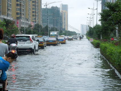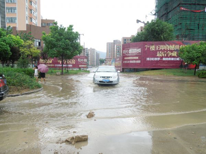 8時(shí)30分,在淮河新城小區(qū)內(nèi),由于暴雨的降臨,小區(qū)內(nèi)道路積滿了雨水,雨水不能及時(shí)排放,出行的居民踏著雨水行走在小區(qū)內(nèi),出門極為不便。