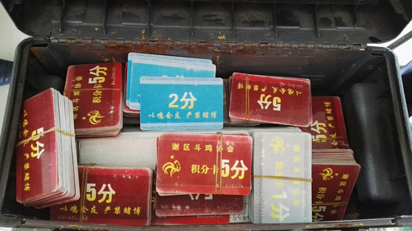 接到群眾報(bào)警后,望峰崗派出所向分局匯報(bào),同時(shí)進(jìn)行秘密偵查,漸漸摸清了場(chǎng)所內(nèi)的情況。此處是以斗雞為幌子,實(shí)則展開(kāi)聚眾賭博的窩點(diǎn)。斗雞的組織方為“謝家集區(qū)斗雞協(xié)會(huì)”,名為娛樂(lè)活動(dòng),現(xiàn)場(chǎng)還放置了各種比賽獎(jiǎng)杯,然而出入該場(chǎng)所的人都心知肚明,這是以斗雞為形式的賭博,賭博開(kāi)始后,由兩方分別抱著兩只雞進(jìn)入封閉的比賽場(chǎng),參賭的人們根據(jù)勝負(fù)預(yù)判自行下注,賭哪方的雞會(huì)斗贏。下注可以通過(guò)購(gòu)買(mǎi)卡片的方式,有灰色、藍(lán)色和紅色三種顏色的不同卡片,最小下注額100元,上不封頂。了解到這些情況后,公安機(jī)關(guān)決定伺機(jī)對(duì)這一賭博團(tuán)伙進(jìn)行抓捕。