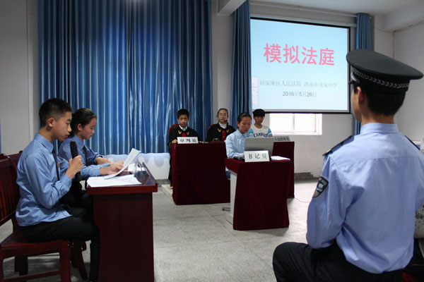 “現(xiàn)在開庭……”隨著“審判長(zhǎng)”敲響的清脆的法槌聲,5月26日下午,田家庵區(qū)法院的“模擬法庭”在龍泉中學(xué)開庭,庭上審理了一起聚眾斗毆案件。該校130多名初一師生進(jìn)行觀看。