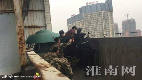 4月7日下午4時(shí)許,特警支隊(duì)特勤大隊(duì)商貿(mào)步行街巡邏組接到110指令稱:在田家庵區(qū)政府對(duì)面的錦繡廣場(chǎng)樓頂處有人要跳樓,請(qǐng)?zhí)鼐?duì)員迅速前往增援。特勤大隊(duì)民警收到指令后,火速趕往事發(fā)現(xiàn)場(chǎng)。當(dāng)?shù)竭_(dá)錦繡廣場(chǎng)樓下時(shí),事發(fā)地周邊已有多名群眾圍觀張望,樓頂有一男子不時(shí)將腿翻過樓頂護(hù)欄欲跳樓輕生,情況十分緊急。為了安全起見,民警迅速疏散周圍群眾并沖上樓頂,見一中年男子情緒十分激動(dòng),并叫嚷著讓民警不要靠近,否則便要從樓頂跳下去。民警經(jīng)走訪了解,該男子姓彭,可能精神有問題,通過語(yǔ)言溝通無法將其勸下來。通過對(duì)現(xiàn)場(chǎng)情況短暫的研判,發(fā)現(xiàn)該男子左右兩側(cè)都有掩體可以迂回至該男子身后,這樣可以趁其不備將其救下。以防情況繼續(xù)惡化,民警迅速分成兩組,迂回至該男子身后,發(fā)現(xiàn)有民警靠近,該男子突然將腿伸出護(hù)欄外準(zhǔn)備往下跳,民警以迅雷不及掩耳之勢(shì)控制該男子左右兩臂并將其拖下來,成功將其解救。