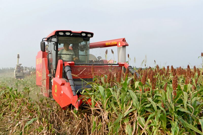 10月8日,淮南農場組織機械搶收高粱。(記者 陳彬 攝)