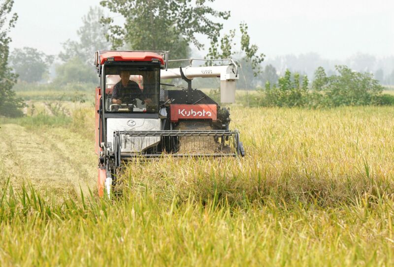 10月12日,壽西湖農場職工們搶抓農時,駕駛收割機收割水稻。 (記者 陳海濤 攝)