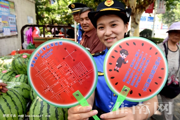 6月25日,淮南市謝家集區(qū)城管行政執(zhí)法局工作人員向瓜農(nóng)發(fā)放印制在扇子上的西瓜銷售地圖,方便他們銷售。自2011年以來,淮南市城管行政執(zhí)法局連續(xù)8年分區(qū)域合理設置夏季瓜果銷售點391處,印制“西瓜地圖”,變堵為疏,變管理為服務,方便瓜農(nóng)賣瓜和市民買瓜。(陳彬 攝)