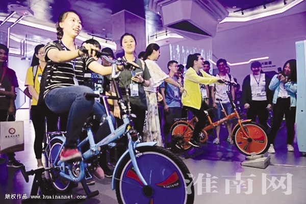 7月10日,臺(tái)灣大學(xué)生來(lái)到國(guó)家“智慧城市”試點(diǎn)市安徽省淮南市參訪,參觀淮南在科技創(chuàng)新等領(lǐng)域取得的成就。圖為臺(tái)灣大學(xué)生在淮南高新區(qū)大數(shù)據(jù)展示中心體驗(yàn)?zāi)M騎行自行車。(陳彬 攝)