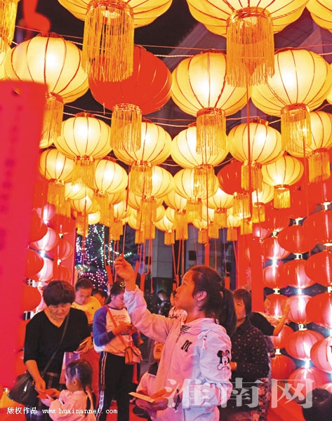 安徽淮南泉山湖社區(qū)群眾在燈展中猜燈謎。(陳 彬 攝)