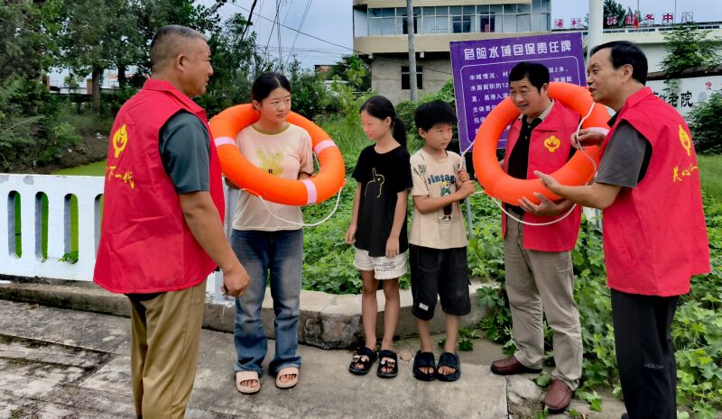 暑假期間,鳳臺(tái)縣關(guān)店鄉(xiāng)關(guān)工委聯(lián)合中小學(xué)教師、村(社區(qū))工作人員,持續(xù)開展防溺水宣傳活動(dòng),切實(shí)增強(qiáng)青少年安全防范意識(shí)。圖為工作人員正在向孩子們講解救生圈使用方法。