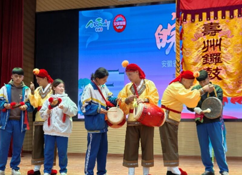 演出現(xiàn)場,淮南文旅推薦官楚小南與師生們的熱情互動瞬間點燃了全場氣氛。在主持人的帶領(lǐng)下,全場齊聲高唱《國家》,激昂的歌聲抒發(fā)了對祖國的熱愛;省級非遺壽州鑼鼓《喜鵲登枝》的表演則成為整場演出的亮點。高二學生玉蘇普江·納斯爾江和幾位同學自告奮勇登臺,在傳承人手把手指導下學習鑼鼓技藝,他興奮地稱,“壽州鑼鼓的節(jié)奏感很特別,這種需要團隊協(xié)作的表演形式很有感染力!