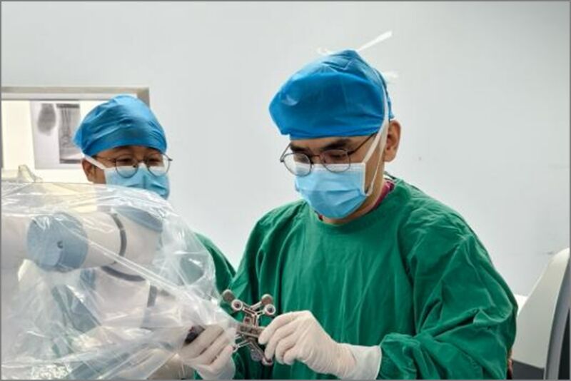 醫(yī)生借助骨科手術(shù)機(jī)器人開展精準(zhǔn)手術(shù)(圖片由淮南新華醫(yī)院提供)