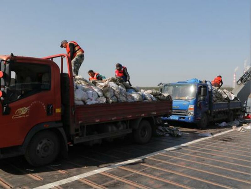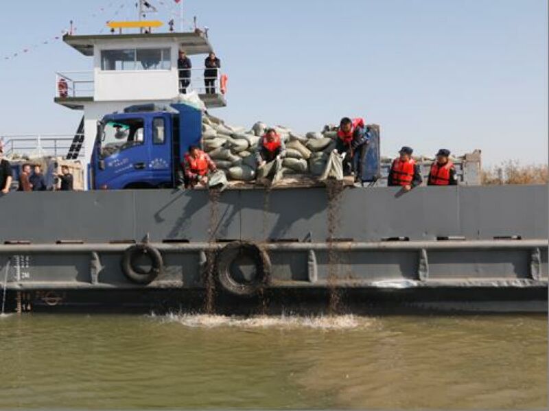 此次人工增殖放流活動為淮南港3號水上綜合服務區(qū)項目所開展的生態(tài)補償,活動地點位于平圩淮河大橋上游的原連崗碼頭處,該水域?qū)儆诨赐豸~保護區(qū)實驗區(qū)。為確保安全,此次人工增殖放流活動租用了大型渡運船。因底棲生物貨源不同,渡運船先后從淮河北岸及南岸載運裝有底棲生物的貨運車,共計7輛,在船上安置穩(wěn)妥。