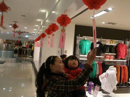 記者在龍湖南路某大型購物商場內(nèi)看到,商家將一個個燈籠掛在走道上,并墜上燈謎供市民選猜,答對的市民還可領(lǐng)取一份紀(jì)念品。“謝絕參觀(打一字)”、“舉杯邀明月(下半句是什么)”、“東施(打一字)”百余條難易各異的燈謎既讓市民體會到元宵節(jié)的樂趣,同時也為商家吸引了不少顧客。