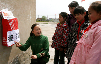 如今低碳生活已深入到中小學(xué)生心中,環(huán)保、節(jié)能成為新時(shí)尚。圖為九龍崗第二小學(xué)學(xué)生和老師將廢紙袋制作成學(xué)校的報(bào)箱。