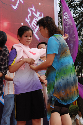 “愛(ài)心媽媽”為福利院孩子試穿毛衣。