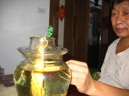 據(jù)吳長(zhǎng)建介紹,這株人參是2008年朋友為他從山東帶回來(lái)的。聽說(shuō)人參泡酒效果不錯(cuò),雖然自己并不喝酒,但因?yàn)?0多歲的老岳父偶爾“好喝兩口”,因此他決定將人參用來(lái)泡酒。之后,他找出一個(gè)酒壇,開了2瓶瓶裝酒倒入壇中,將人參和枸杞等物一同浸泡。