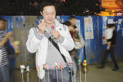 9月27日,記者在市商貿文化廣場附近見到了段軍,搓、捏、粘、削,他的一雙巧手真叫人贊嘆。段軍的小攤子被年輕人圍了個水泄不通。“老板,‘黑執(zhí)事’你能捏嗎?”“老板我想訂做一個‘火影忍者卡卡西’”。不熟悉動漫的讀者,您聽著“黑執(zhí)事”、“火影忍者卡卡西”這些名字是不是很困惑。其實,這些人物都是時下流行的動漫作品中的主人公。再仔細一瞧,段軍小攤子前排的作品,清一色的都是這些時尚的動漫人物——馬里奧、機器貓、皮卡丘……別的藝人都是捏十二生肖,捏民間傳統(tǒng)形象人物,為什么段軍卻捏這些動漫形象呢?他是從哪里學來的這門手藝呢?