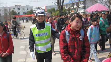 2004年下半年,剛剛成立的公路巡邏大隊聽到許多小學(xué)生家長呼聲:寶島希望小學(xué)眾多學(xué)生每天穿越國道時,非常讓人揪心。針對這一特殊情況,公路巡邏大隊向曹庵中隊下達(dá)一項特殊任務(wù):開展“大手拉小手,護(hù)送800多名學(xué)子安全過國道”活動,確保眾學(xué)生安全過國道。曹庵中隊接到任務(wù)后,結(jié)合本中隊實際情況,將中隊交警分成4個小組,每組4名交警,每天輪流護(hù)送孩子放學(xué)。從2004年9月1日開始,每天4名交警接時來到寶島希望小學(xué),將放學(xué)的學(xué)生集中起來,排成長隊。2名交警在國道上指揮來往車輛,2名交警站在隊伍兩旁。7年來,除了學(xué)校放假和雙休日外,每天都有4名交警風(fēng)雨無阻,按時來到校園,護(hù)送眾多學(xué)生過國道。老師和家長們都說:“孩子們再也離不開這些叔叔、阿姨了!