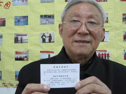 5月29日,記者采訪到了楊輝,他首先向記者展示了這張“好人卡”,老人還給它起了個(gè)名字叫做“健康文明贈(zèng)卡”,這張卡片是由楊老親自設(shè)計(jì)并自費(fèi)印制的,只見“健康文明贈(zèng)卡”上寫著“謝謝您的文明之舉,您是城市文明的榜樣,是您的親屬之驕傲。我們應(yīng)向您學(xué)習(xí),望發(fā)揚(yáng)光大!倍路绞抢先司倪x擇的與健康、快樂相關(guān)的各種小知識,目的是希望對方健康幸福,所有的感激與回報(bào)之情都濃縮在了這樣一張小小的卡片上了。楊輝老人告訴記者,設(shè)計(jì)這樣一張“好人卡”的初衷很簡單,現(xiàn)代社會(huì)好心人越來越多了,每當(dāng)老人乘坐公交車時(shí),就會(huì)有人讓座;每當(dāng)老人過馬路時(shí),也會(huì)有人攙扶;每當(dāng)行人問路時(shí),也會(huì)有熱情的市民為其指路……看到這些好心人在做好事時(shí),他就希望這些好心人能夠感受到被幫助人的感謝之情,如果幫助別人的人們都能夠得到這樣一張“好人卡”的話,他們就會(huì)有更大的動(dòng)力繼續(xù)做好事、做善事,他們在獲得成就感和肯定感的同時(shí)也會(huì)去感染別人。這樣就會(huì)有更多的人參與到做好事的隊(duì)伍中去,這樣,社會(huì)就能夠越變越好,越變越美!