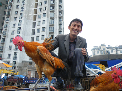 圖為:土雞商李先生從農(nóng)村收來“土雞、溜達雞”販賣到城里,一斤售價最高賣到30元,仍然供不應求。