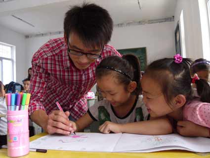 在小學(xué)生集中休息的教室里,記者看到,小學(xué)生們和志愿者們相處融洽。有的小學(xué)生問(wèn):“老師,這個(gè)畫(huà)該怎么畫(huà)。俊庇械男W(xué)生則拉著志愿者說(shuō):“老師,你給我講個(gè)故事吧!泵鎸(duì)40多名小學(xué)生,志愿者們也是忙得不亦樂(lè)乎。