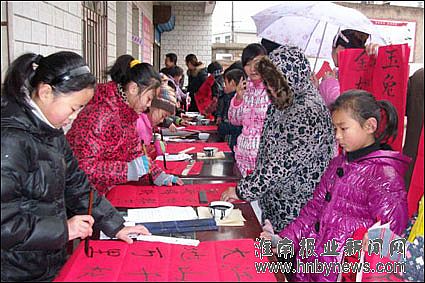 當(dāng)日上午,天氣陰冷細(xì)雨蒙蒙,大通區(qū)上窯鎮(zhèn)方樓村村委會(huì)大院內(nèi)卻人頭攢動(dòng)氣氛熱烈,來自淮南聶老師書法國(guó)學(xué)館的8名小“書法家”們正在這里為村民們免費(fèi)寫春聯(lián)!斑@么小的孩子寫春聯(lián),行不行?”來自方樓村的數(shù)十名村民充滿了好奇,駐足觀看,議論紛紛。沒想到,小“書法家”們一下筆就征服了圍觀群眾,大家連聲稱贊!按髮W(xué)生也寫不到這么好!”“大人也趕不上。 薄敖o我一副!”“我也要一副!”鄉(xiāng)親們爭(zhēng)先恐后地索要著春聯(lián),而一副副春聯(lián)經(jīng)過那稚嫩的小手點(diǎn)染,多了一份藝術(shù)魅力,也融進(jìn)了這些可愛孩子們的天真愿望和真情祝福。一個(gè)上午,100余幅春聯(lián)全部被村民取走了。