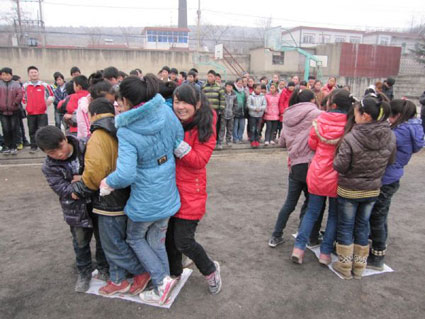 第二個活動,就是要讓八個學(xué)生組成一個團隊,想辦法站在一張報紙上,腳不能挨地,堅持15秒鐘就算贏(如圖)。孩子們都是初中生,剛開始還打打鬧鬧不以為然,但是正式開始后卻都開始認真想辦法,有的抱在一起,有的巧妙站立,“……5、4、3、2、1”,時間到,成功啦!孩子們圍在一起又叫又笑。這就是團隊的力量。志愿者江麗萍說,這兩次活動的主旨就是要拉近孩子們之間的距離,讓他們知道,每個人都是團隊的一員,要用最重要的團隊凝聚力來共同克服困難。