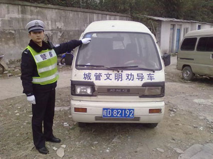 3月12日上午9時許,田家庵二大隊民警正在洞山中路老龍眼路段開展涉牌涉證專項整治行動時,一輛車號為皖D82×××的面包車因未粘貼年檢標(biāo)志被民警攔下。經(jīng)公安網(wǎng)查詢,該車2009年以后就沒有參加年審,未購買第三者強制險。因車身已改色,并粘貼有城管文明勸導(dǎo)車字樣,民警向駕駛?cè)诉M行查詢。而駕駛員人韓某的回答也讓民警開了眼界,韓某稱自己并非城管工作人員,但此車是用來幫助城管部門清理路邊小廣告的,后來他為了方便,才模仿城管巡邏車私自改了色,并粘貼了“勸導(dǎo)車”字樣。