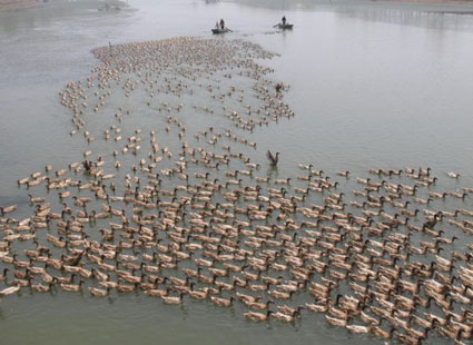 尹家河是泥河連接淮河的通道,這段河道水質(zhì)清潔,水草、魚蝦資源豐富,曹尹村村民陸友利就充分利用這一得天獨(dú)厚的有利條件,采取自然放養(yǎng)的方法養(yǎng)殖鴨子,每年都能獲得可觀的收入。