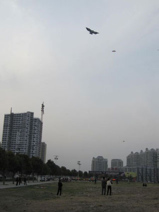 3月26日下午,記者在朝陽(yáng)東路大轉(zhuǎn)盤附近的空地上看到,至少三四十人在這里放風(fēng)箏,有情侶,也有父母帶著孩子的,樣式繁多、五顏六色的風(fēng)箏在天空中飄著,別有一番趣味。這時(shí),一個(gè)老鷹樣式的風(fēng)箏飛上了天空,并迅速引起了人們的注意,因?yàn)樗粌H僅是在天空中飛,而是完成了旋轉(zhuǎn)、俯沖等一系列高難度動(dòng)作,讓周圍的市民都目瞪口呆,這是風(fēng)箏嗎?記者帶著疑問走上前問道,市民劉先生告訴記者,“沒錯(cuò),這是特技風(fēng)箏,它和傳統(tǒng)的單線風(fēng)箏有所不同,有幾根線同時(shí)操縱,非?简(yàn)人的手腦心的配合!苯又肿岋L(fēng)箏表演了正旋轉(zhuǎn)、反旋轉(zhuǎn)以及飛“8”字路線,使人贊不絕口。