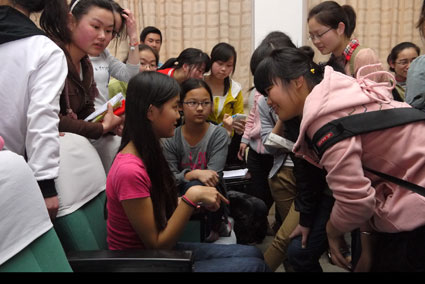 圖一、交流現(xiàn)場氣氛活躍。圖二、淮春潔和學生們打成一片。