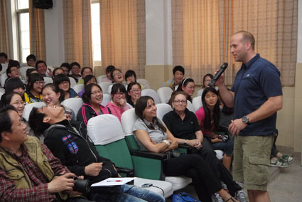 4月16日,美國友人安德魯先生帶著他的中國女兒,以及他的愛人、朋友們一起,來到淮南三中做客,和學生們一起談天說地,為學生們提供了一次非常寶貴的口語交流機會。在近3個小時的交流過程中,從“你喜歡科比還是詹姆斯”到“您和您的愛人是怎么相愛的”,學生們的問題五花八門,出其不意,笑料十足,F(xiàn)場學生即興唱起了“淮南歡迎你”,和安德魯先生一起打著節(jié)拍說起R&B,氣氛十分火爆。
