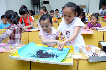 用舊衣服做成的京劇臉譜,用可樂瓶蓋和包裝泡沫做成的“大樹”,一個個創(chuàng)意作品,伴隨著孩子的美好心愿就這樣應(yīng)運而生了。22日下午,淮師附小洞山校區(qū)里,來自二年級的100多名孩子,組成45組參賽組,展開了一場別有生趣的“暢想貼畫”比賽。比賽現(xiàn)場,孩子們2-3人一組,用事先準(zhǔn)備好的環(huán)保材料,在規(guī)定的30分鐘內(nèi)完成一幅有意義的創(chuàng)意貼畫作品。作品里包含水族館、美麗家園那樣的景物,也包含一些諸如“掩耳盜鈴”的成語故事,孩子們用布拼出笑臉,用棉花做成白云……