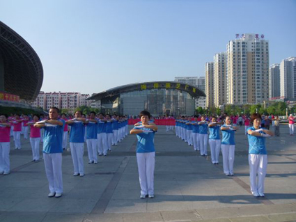 早上7點(diǎn),記者來到市體育文化中心,高亢的音樂聲遠(yuǎn)遠(yuǎn)地就傳入耳中。一眼望去,廣場(chǎng)上400多人正隨著音樂的節(jié)拍表演有氧健身操?,他們穿著一致的服裝,迎著旭日,個(gè)個(gè)精神煥發(fā);他們不分年齡,動(dòng)作整齊標(biāo)準(zhǔn),顯出專業(yè)水平。在廣場(chǎng)的正中心,一群身穿紅色運(yùn)動(dòng)服的舞者吸引了記者的目光,在《最炫民族風(fēng)》的音樂聲中,他們每人手中揮舞著一個(gè)小球,有節(jié)奏地旋轉(zhuǎn)身體,舞蹈的別樣神韻吸引了眾多市民駐足觀看。