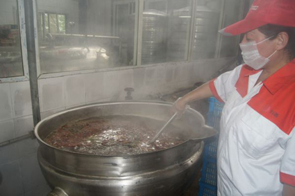 剛走進干凈整潔的制作車間,一股濃濃的牛肉香味撲鼻而來,只見制作車間內(nèi)一口直徑約為110cm的不銹鋼甲沖鍋內(nèi),幾十斤牛肉和大骨正在翻滾,讓人看了不禁垂涎三尺。“我們的牛肉用的是皖北特有的黃牛肉,牛齡在3-5歲之間, 這樣的牛肉再加上由29種滋補中草藥配制成的料包,熬出來的湯能不香嗎?”一位工人邊攪動鍋中的牛肉邊驕傲的和記者說著。