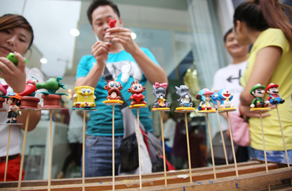 8月23日,商貿(mào)文化廣場里,有位巧手藝人,專門為情侶們制作卡通泥人。一塊泥巴,經(jīng)過這位年輕人的手一捏,不到5分鐘,就可以捏出一副卡通泥人玩偶!疤蓯哿,我要我要”一位女生拉著男朋友的手說。另外一位市民表示,這個卡通人物是男朋友經(jīng)常玩的游戲角色,就買這個送男友了。據(jù)了解,這位手藝精湛的年輕人經(jīng)常會在工作之余到商貿(mào)擺攤做泥人,正逢七夕情人節(jié),特意制作了很多情侶版的卡通泥人吸引情侶們。