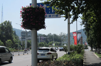 一簇簇矮牽牛被懸置在路燈燈桿上,成為城區(qū)路邊一道美麗的街景。9月5日,記者沿著淮河大道向洞山隧道走去,在道路邊上看到,每隔數(shù)米遠(yuǎn)便有許多粉紅色的矮牽牛簇?fù)碓诼窡魺魲U上(如圖),在陽光照耀下,鮮艷奪目。在靠近洞山隧道北側(cè)的一段人行道旁,還放置了一排整齊的孔雀草。印有“淮南豆腐 香飄世界”的彩旗迎風(fēng)飄動(dòng),凸顯節(jié)日的喜慶。“懸空”的矮牽牛、地面的孔雀草與道旁的綠樹一起,構(gòu)成了一幅美麗的立體風(fēng)景畫,吸引過往行人駐足觀賞、拍照。