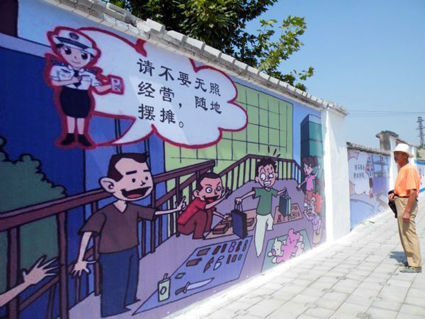 據(jù)路邊的居民告訴記者:現(xiàn)在整條田大南路道路兩邊的墻上都刷上了乳白色的涂料,貼上了像電影屏幕一樣大小的漫畫,走在路邊看著它們心里感覺特別舒服。這些居民還告訴記者:以前田大南路道路兩邊的圍墻灰不溜秋的比較土氣,有些地方圍墻還有缺失,比較難看,現(xiàn)在圍墻被統(tǒng)一刷成了白色,還貼上了那么多的漫畫,感覺城市的檔次一下上去了,尤其是這些漫畫真好看。