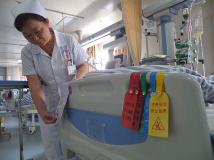 10月14日,記者在淮南新康醫(yī)院看到,該院病房內(nèi),病人的手腕上已經(jīng)佩戴了一個包括病人姓名、年齡、性別等身體標(biāo)識的腕帶,而在病人的床尾顯眼處則掛著不同色彩的塑料標(biāo)牌,這些標(biāo)牌上有的印著“絕對臥床休息”“小心跌倒”,有的則印著“控制滴速”“特殊用藥”等。據(jù)相關(guān)負(fù)責(zé)人介紹:淮南新康醫(yī)院在全市范圍內(nèi)率先引入的這套較為完備的標(biāo)準(zhǔn)化醫(yī)用掛件及標(biāo)簽,可以讓醫(yī)護人員、病患本人及病患家屬一眼就能看到目前患者的用藥情況、病情程度及護理重點,尤其是在重癥監(jiān)護室、手術(shù)室、急救室、新生兒及兒科,患者表述往往會有一定的困難,這個時候這些標(biāo)識就成各項診療操作的重要引導(dǎo),對規(guī)范診療起到不可或缺的作用。采訪過程中,一些患者家人告訴記者:他們在陪護的過程中,只需要看一下床頭卡及護理掛件就能明白家人所處的病情及應(yīng)該注意的事項,感覺這樣的服務(wù)很貼心。